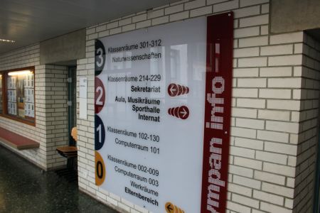 An der Wand in der Mitte befindet sich eine schematische Darstellung der Stockwerke des GymPAN. Jedes Stockwerk hat eine eigene Farbe, die sich bei allen Türen und Schülerschränken im Gebäude wiederfindet und der Orientierung dient.