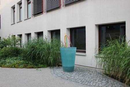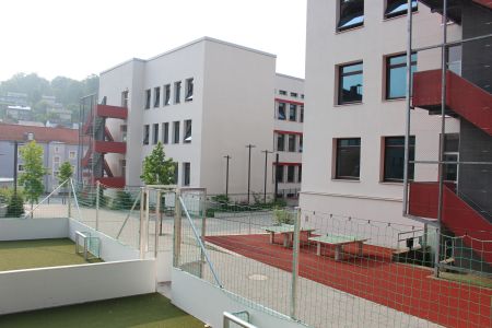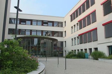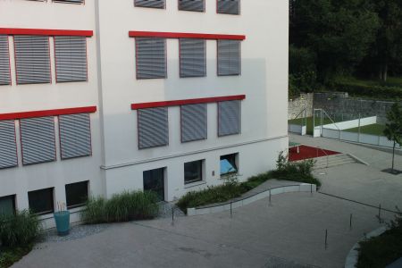 Im Pausenhof des Gymnasiums gibt es für die Schüler viele verschiedene Sitzmöglichkeiten. Zudem sind einige der Plätze von Sonnenschirmen geschützt, sodass sich die Schüler auch an warmen Tagen entspannen können, und nicht der Hitze ausgesetzt sind. Außerdem befindet sich auf dem Pausenhof ein Kiosk, sodass die Schüler und Schülerinnen bei schönem Wetter verpflegt sind und wieder entspannt in den Unterricht zurückkehren können. Da der Essensverkauf am Pausenhof stattfindet, gehen die Schüler in den Pausen zudem ins Freie.