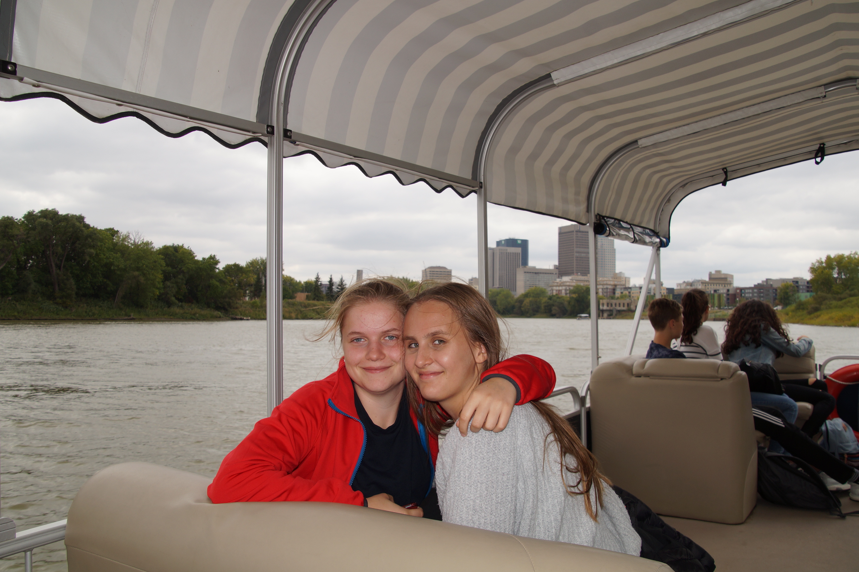 Hannah und Christina bei unserer Bootstour auf dem Red River, bei bewölkten 27°C...