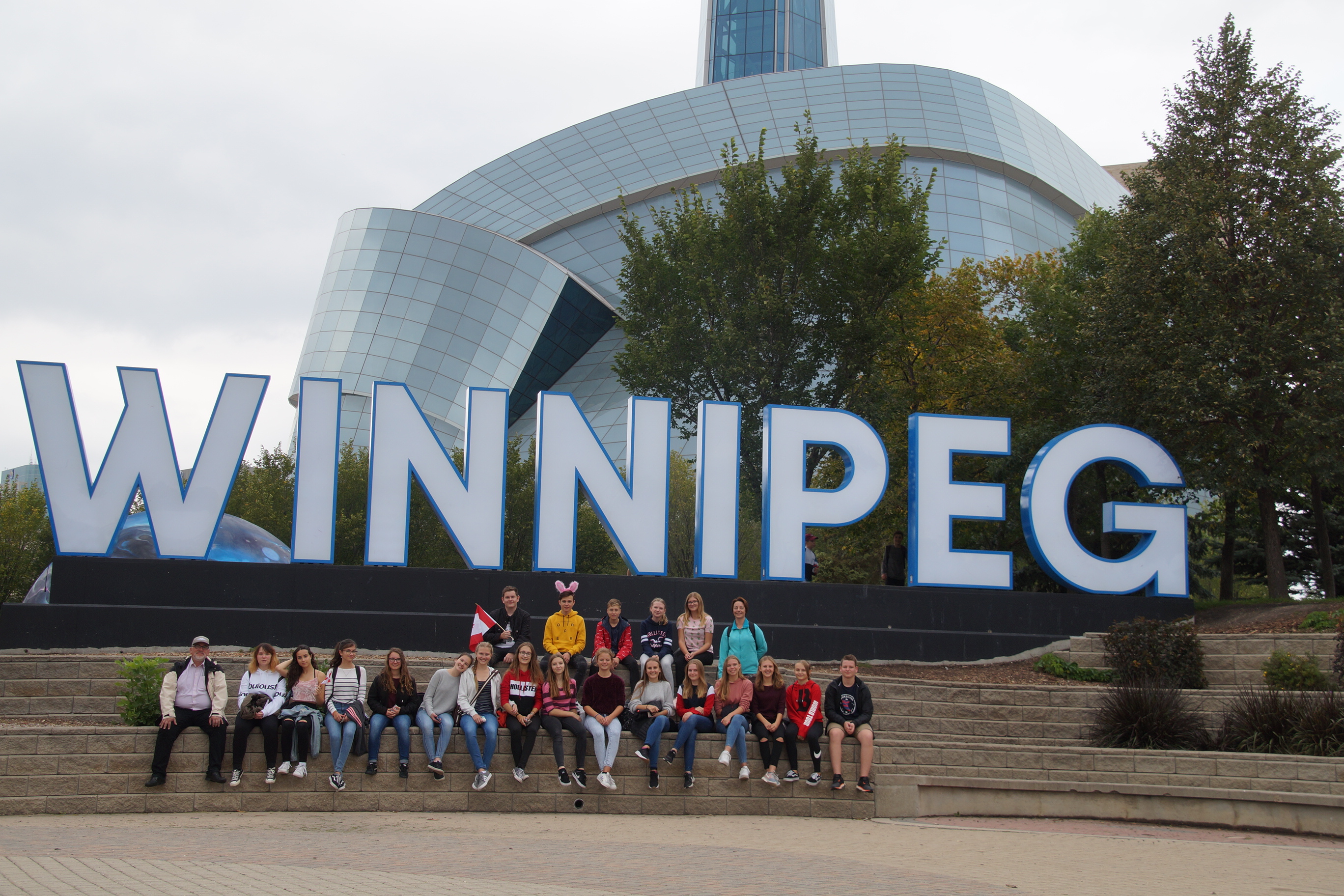 Die Austauschgruppe im Park 'The Forks', im Hintergrund das Museum of Human Rights.